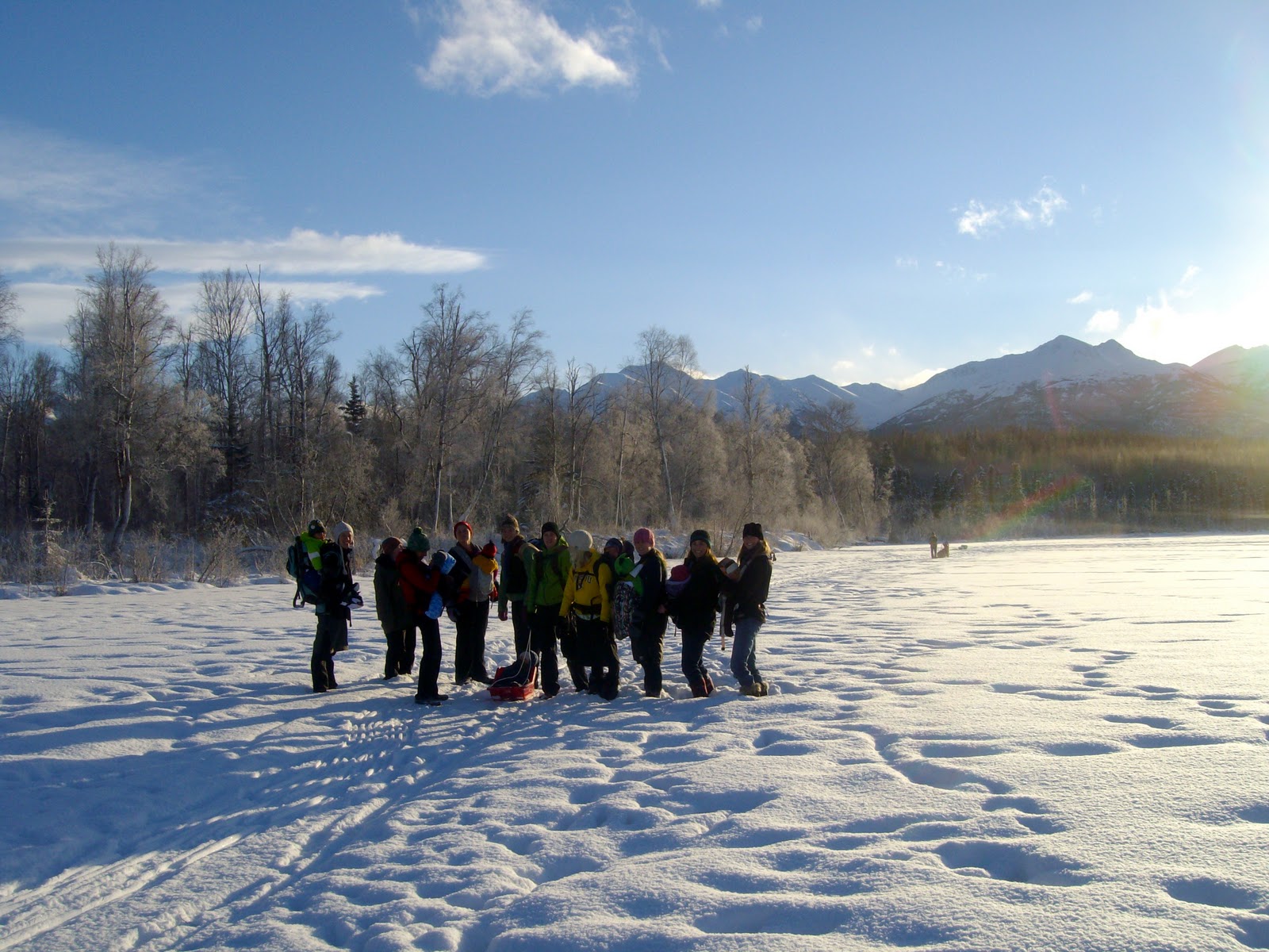 AAAAAAlaska you humble us with your astounding beauty. This might have been the most beautiful day for a Trek to date! The sun was rising, the temps were in the 20s and a light mist rose over the lake. The trees and ground were covered from last nights gentle dusting of fresh powdery snow. We had some new parents join and connections made. Kids trying snowshoes for the first time, sleds being pulled and ridden. We primarily hiked the perimeter of the lake on the frozen ice, but made time to take a quick tangent off to the beach of Cook Inlet with a view of both the Talkeetna and Chugach Mountain Ranges. We must have caught the tide as the water was moving great big ice chunks by at at rapid speed. I tried taking video, but the kiddo on my back was bouncing. Beach Lake Trail is by far this groups favorite spot! We'll be back again, and again, and again.